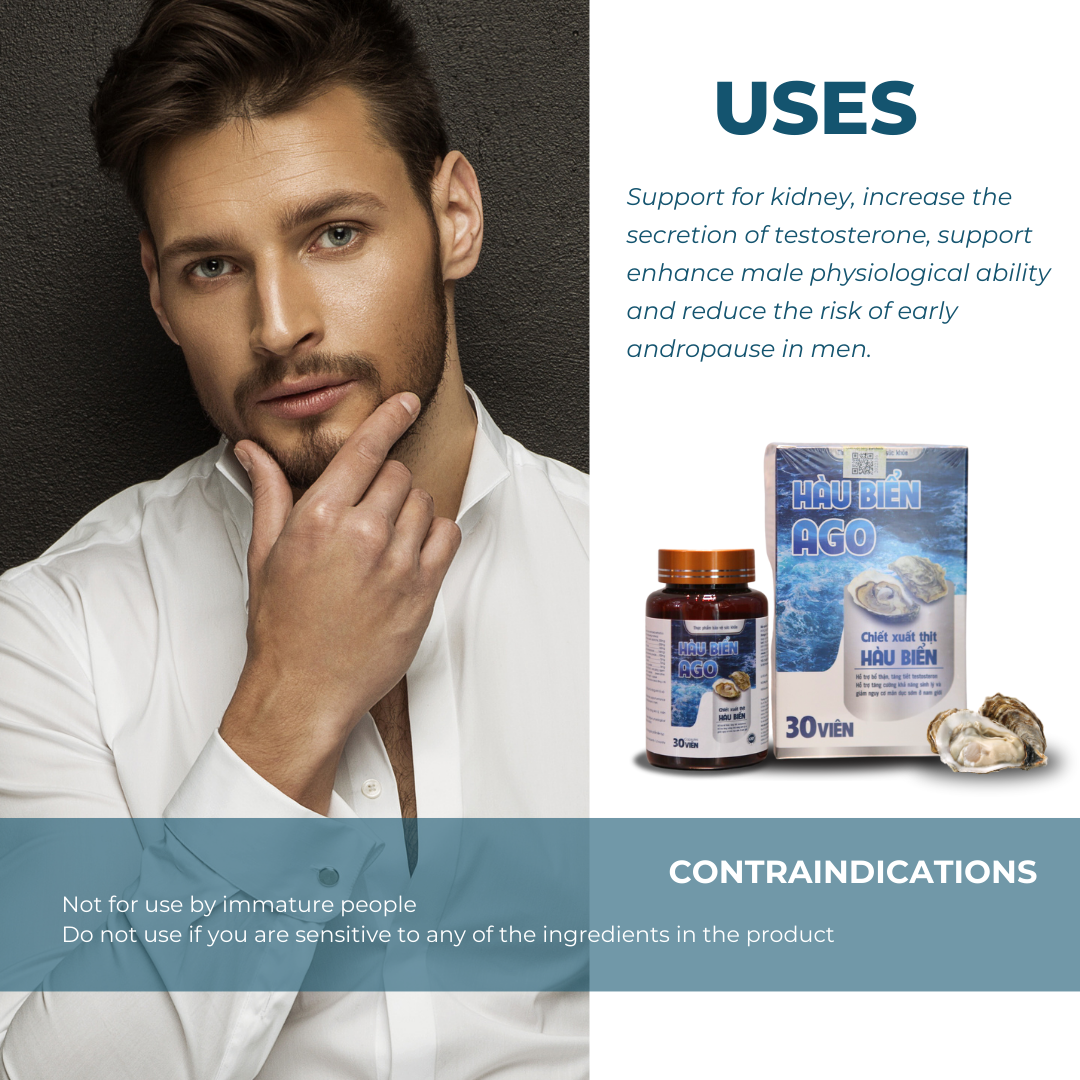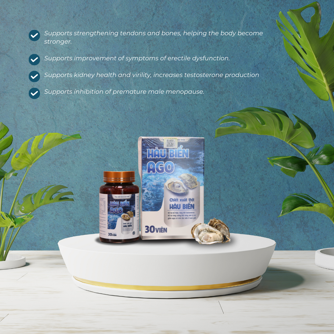 Made from premium Vietnamese sea oyster extract combined with traditional herbs and produced in a GMP-certified facility, AGO SEA OYSTERS provides essential nutrients to restore hormone balance, strengthen vitality, and reduce the risk of early andropause.