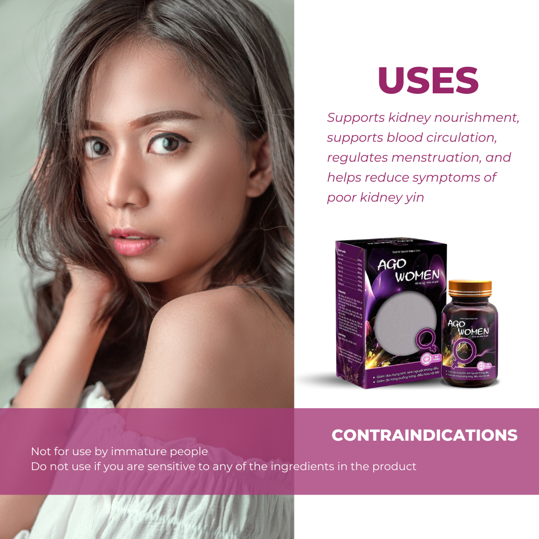 Formulated with Vietnamese herbal wisdom and modern GMP-certified production, AGO Women supports blood circulation, regulates menstruation, enhances female physiology, and strengthens kidney function — the root of hormonal balance.